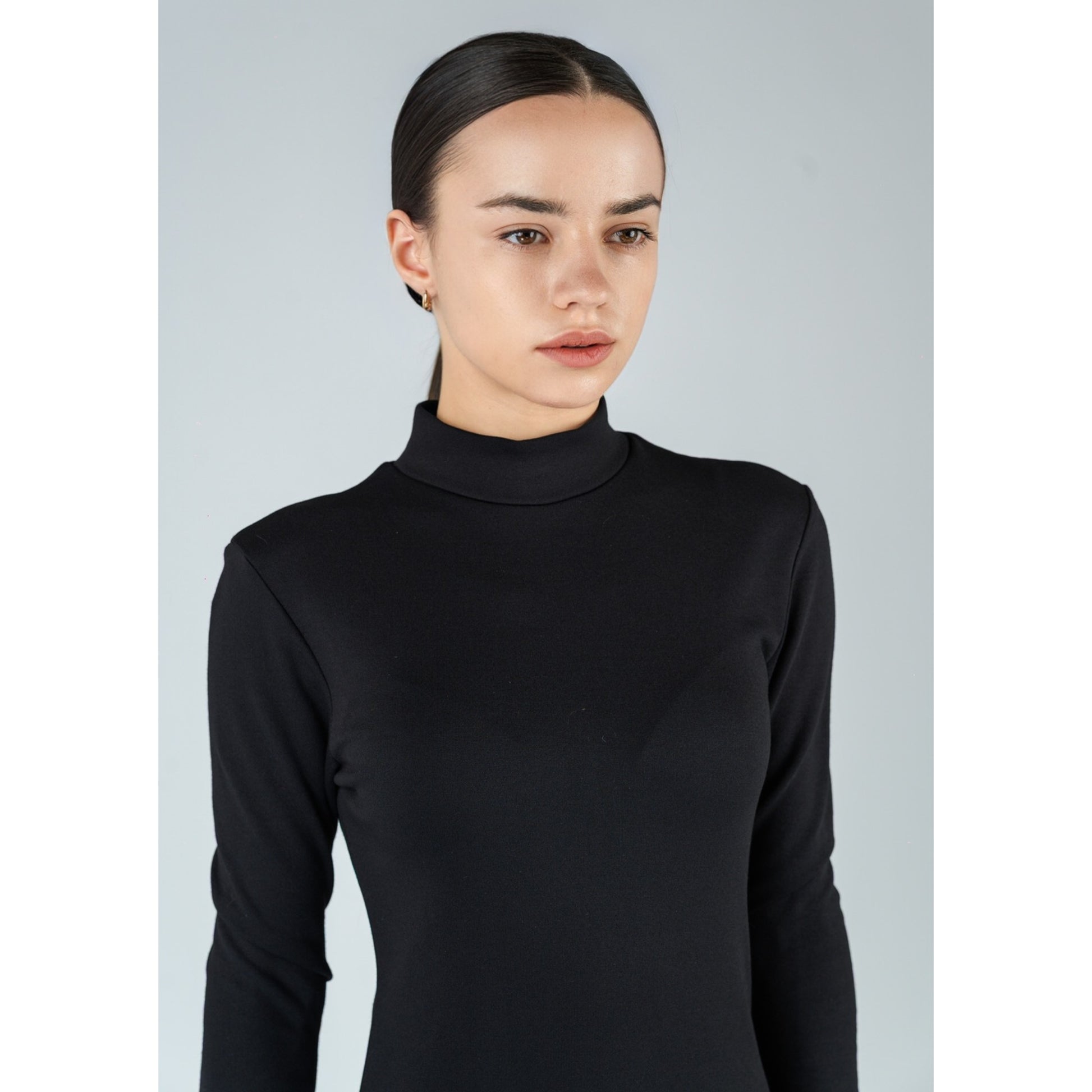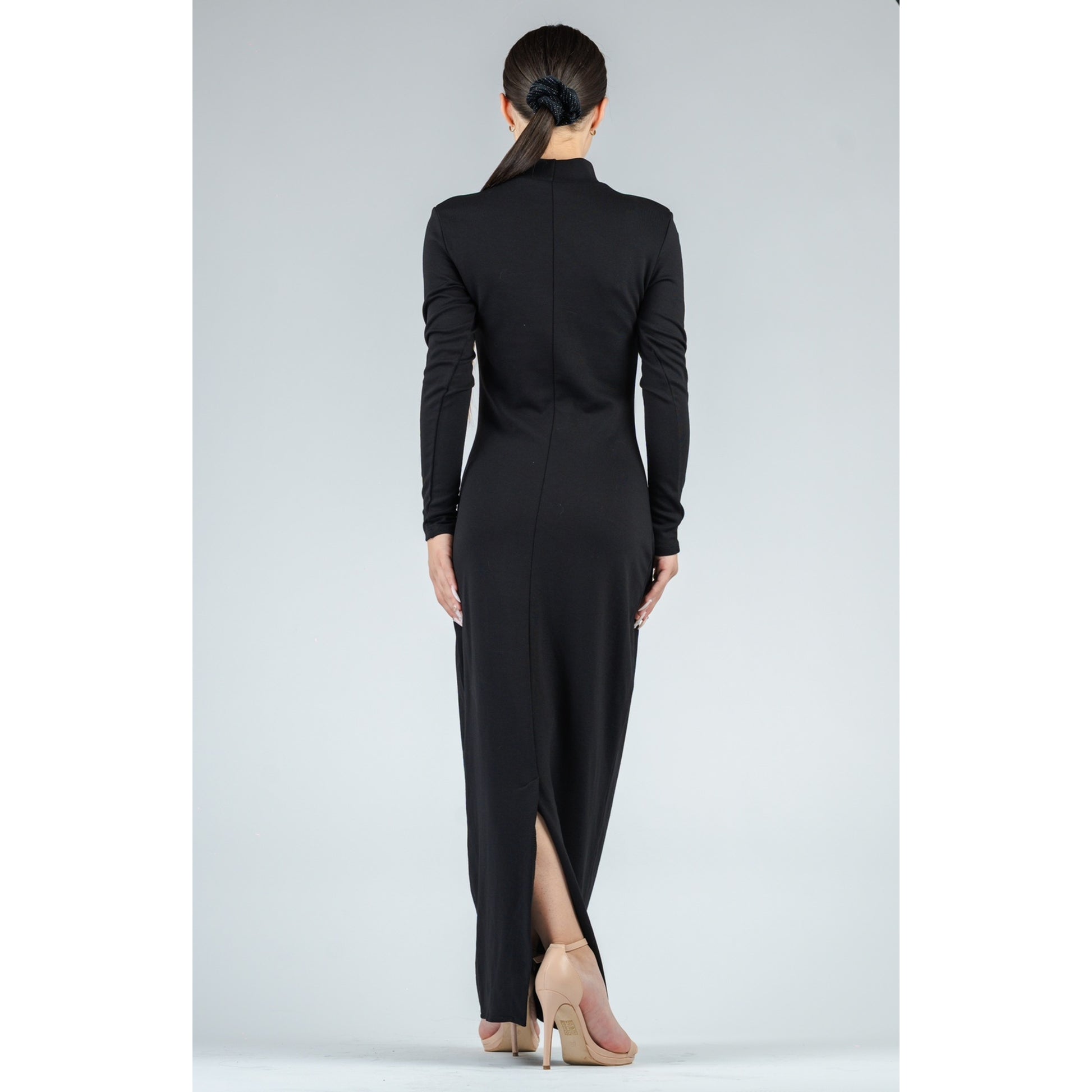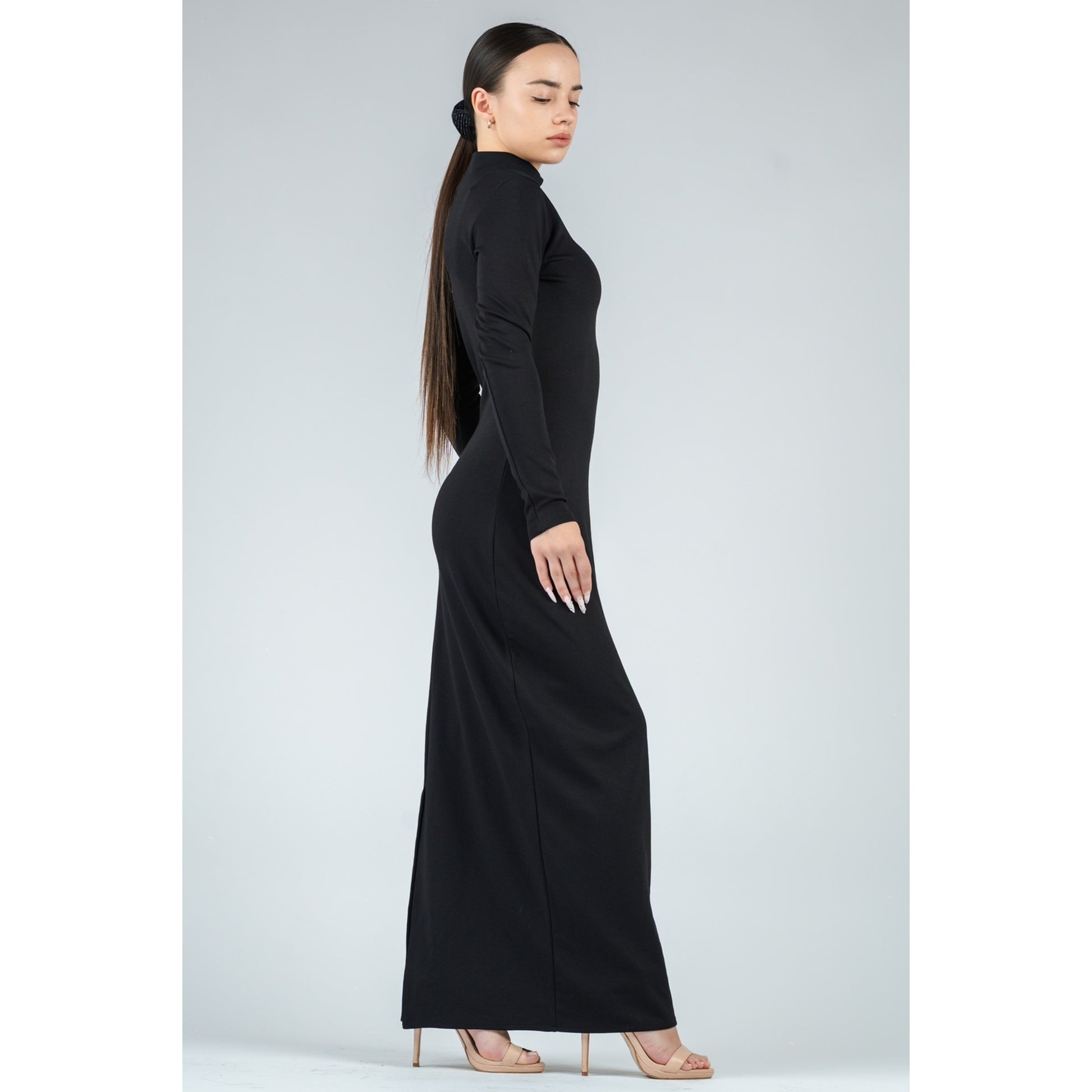Макси рокля с висока яка и дълъг ръкав в черно