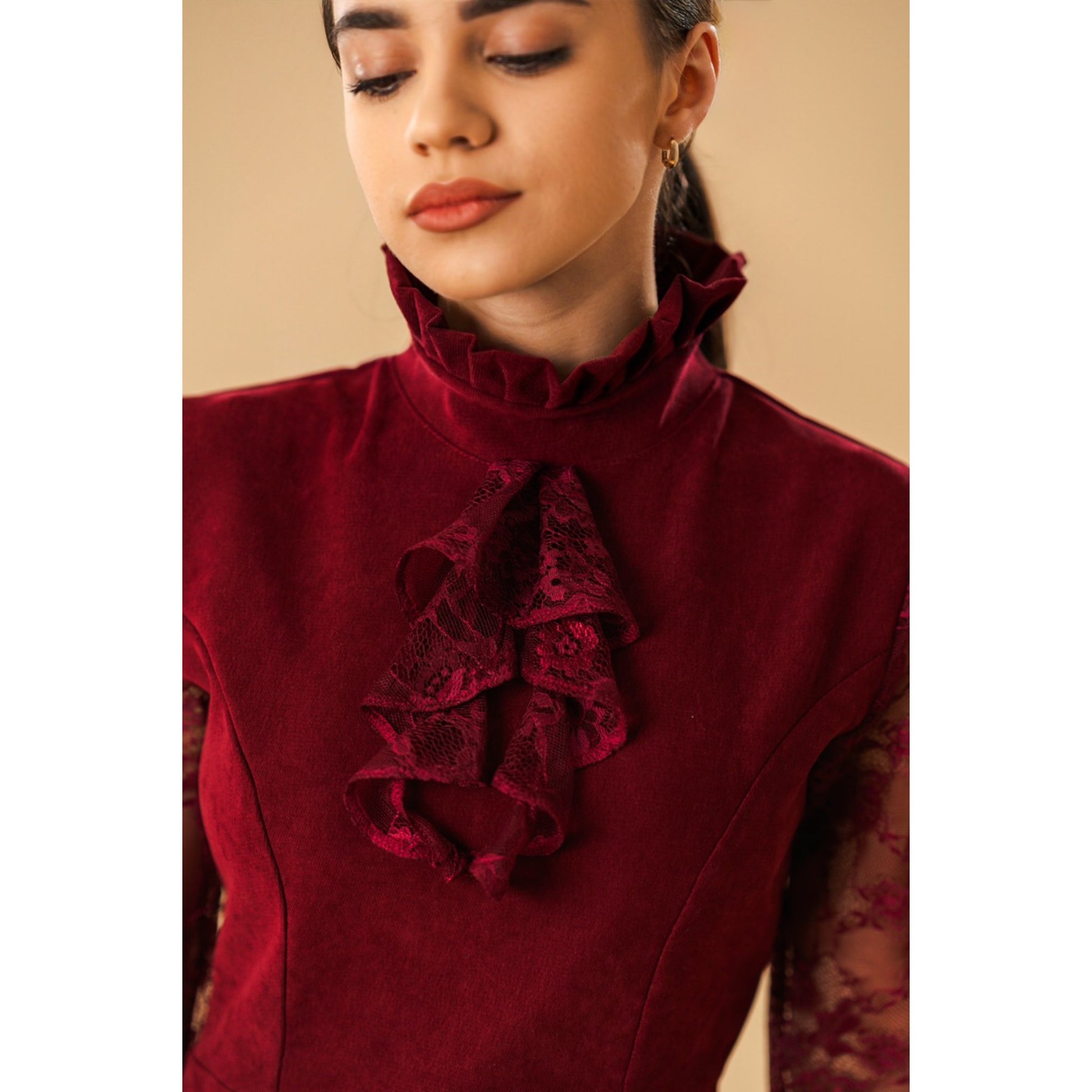 Neckline: High neckline with ruffle detail