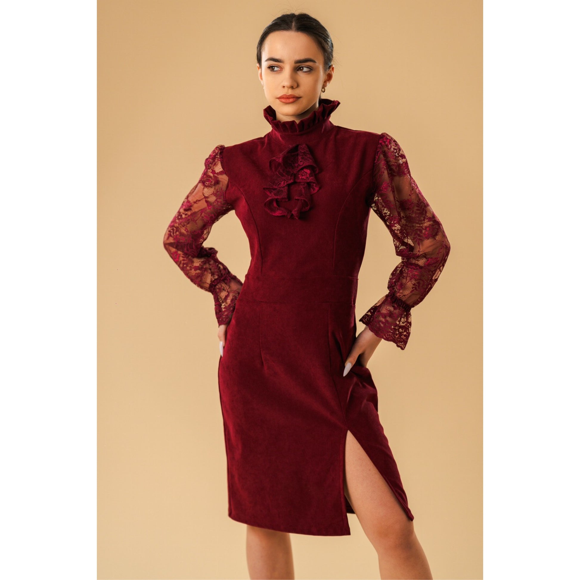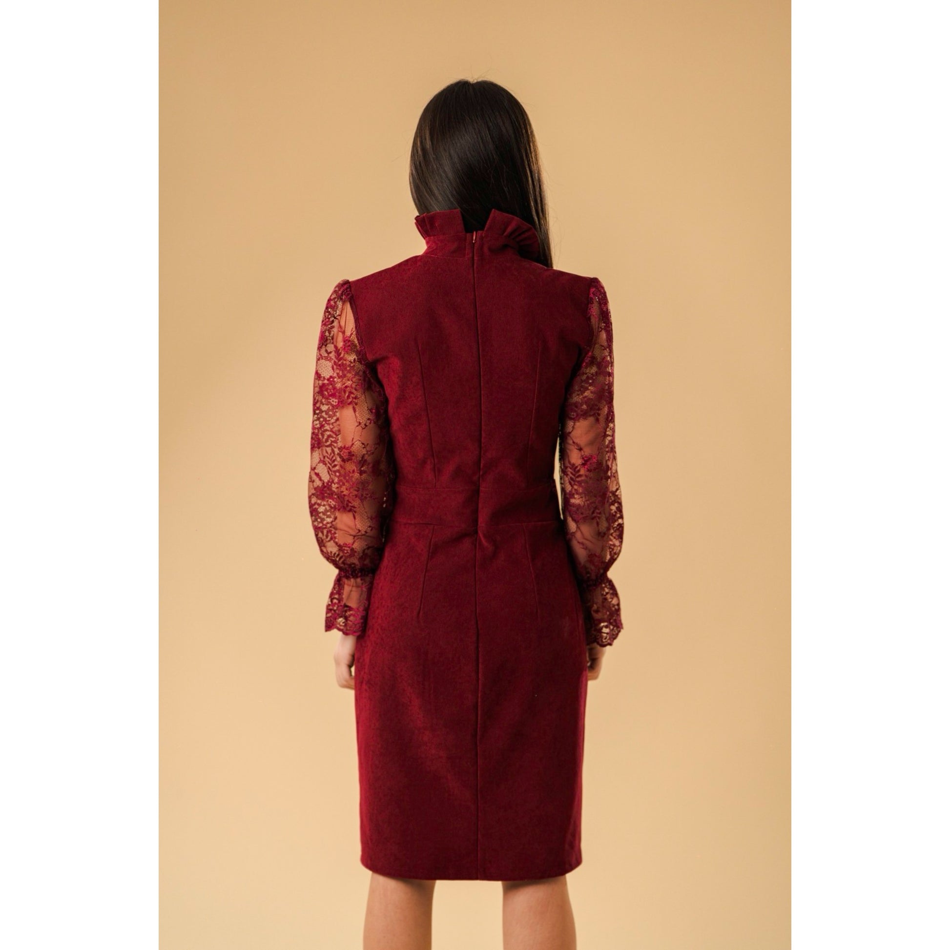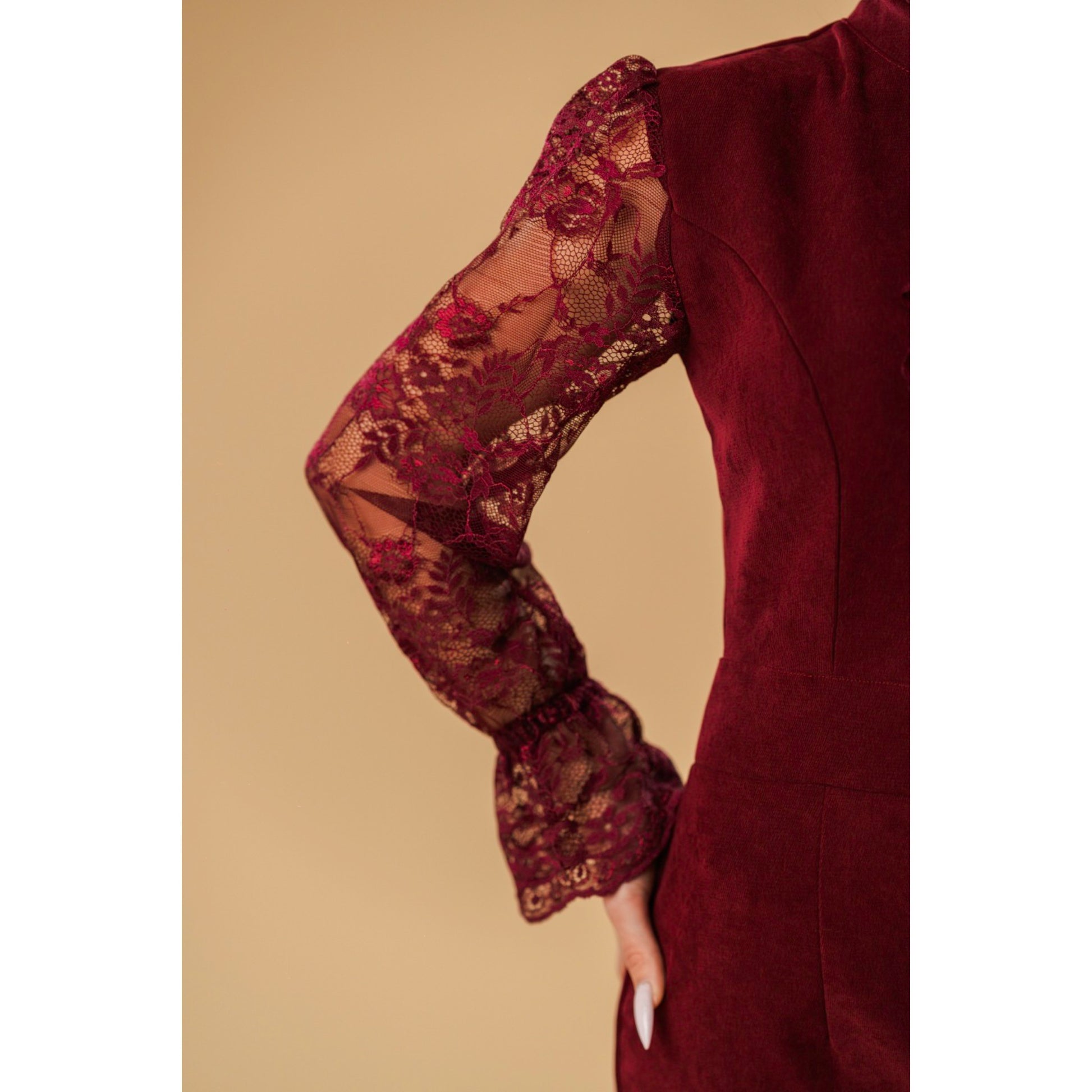 High-Neck Lace-Sleeve Velvet Midi Dress in Burgundy