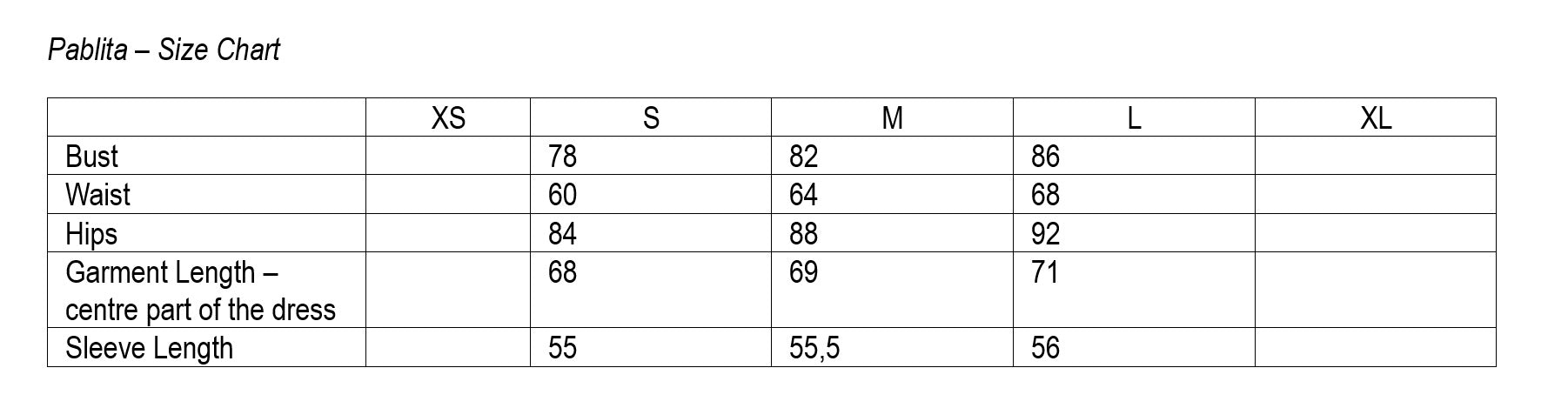 Моделът Пепи (брюнетка) е висока 160 см и носи размер S. Мерките ѝ са: бюст 80 см, талия 59 см, ханш 84 см.