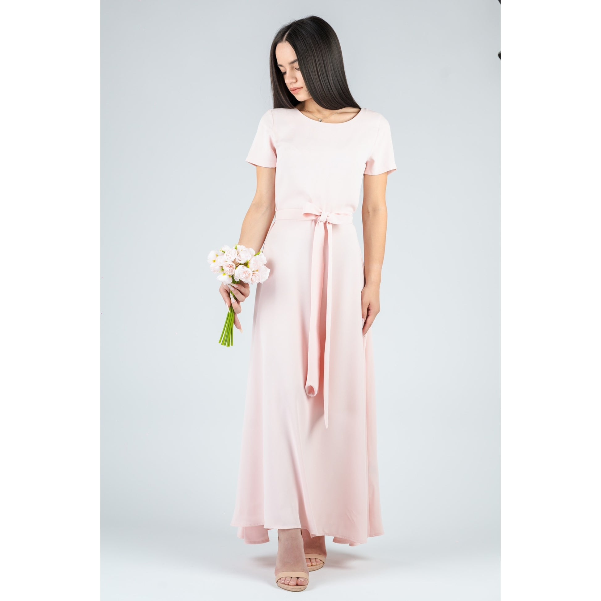 Рокля миди с къс ръкав, заоблено деколте и прилепнал корсаж.